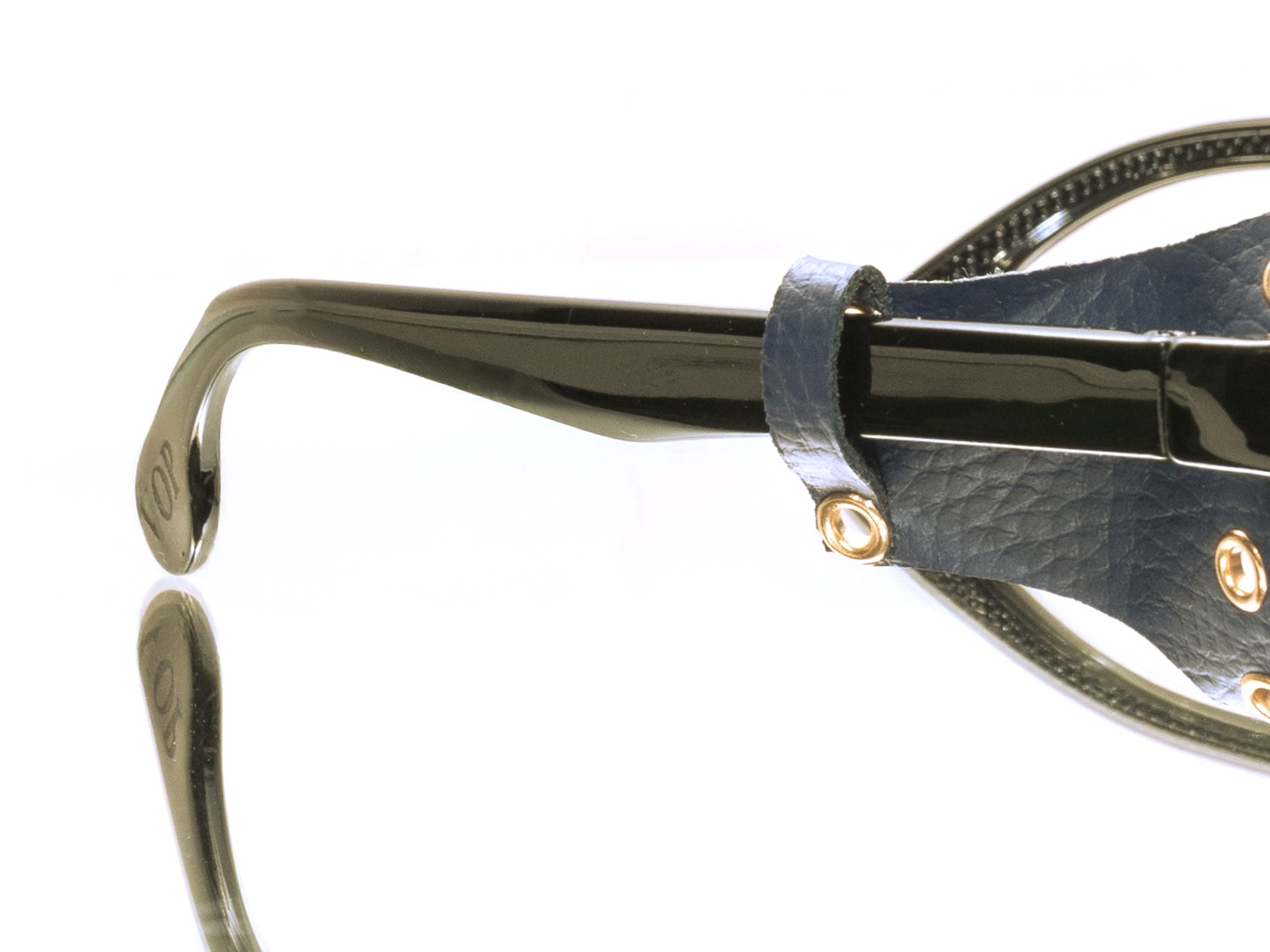 In black resin with dark blue gradient anti-UV lenses, with side leather protection in violin blue.